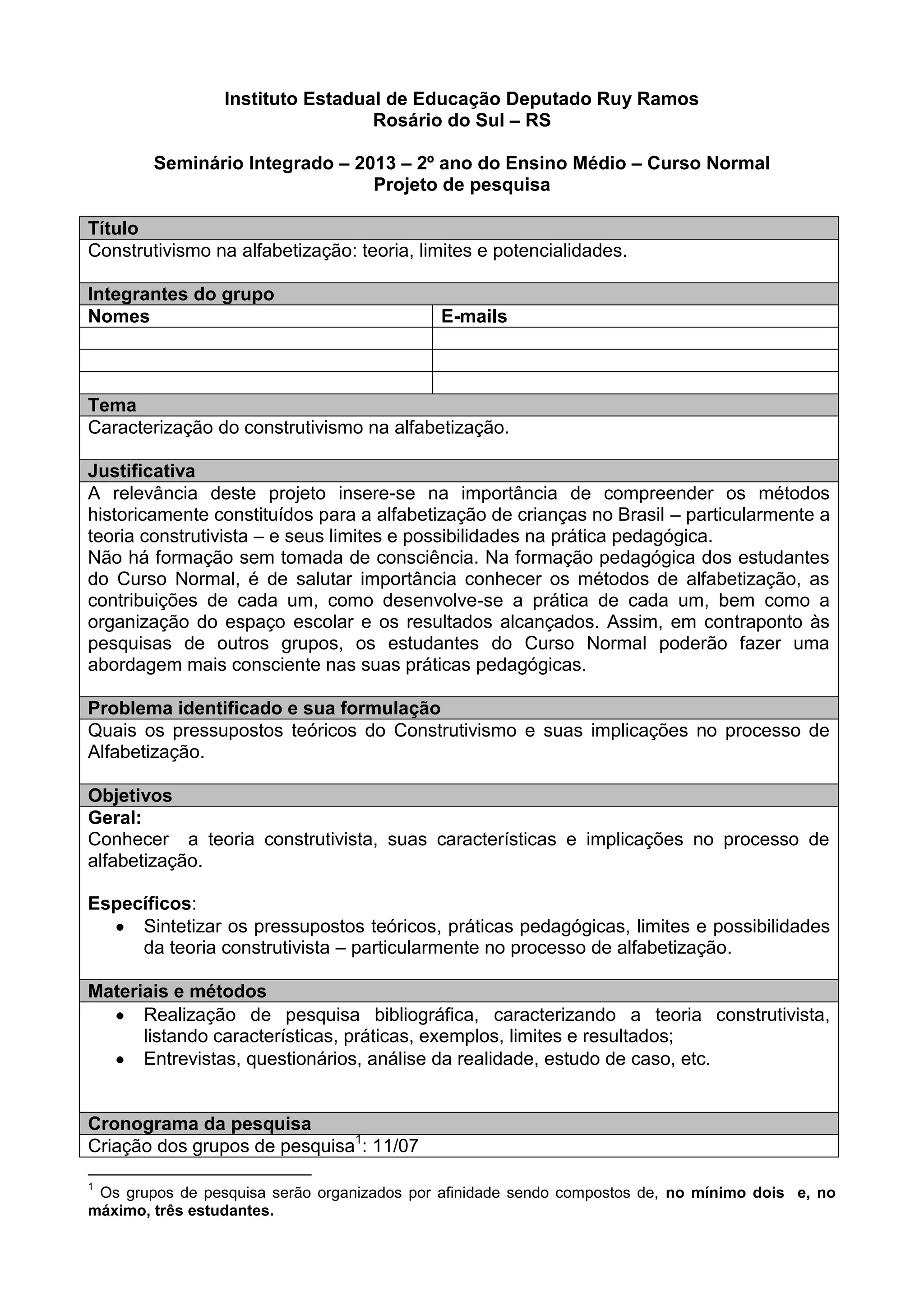 Este documento descreve um projeto de pesquisa sobre a teoria construtivista na alfabetização, realizado por estudantes do Curso Normal. O projeto visa conhecer os pressupostos e implicações do construtivismo no processo de alfabetização, identificando características, práticas, limites e possibilidades por meio de pesquisa bibliográfica e entrevistas. O cronograma inclui elaboração do projeto, pesquisa, relatório e apresentação do seminário.