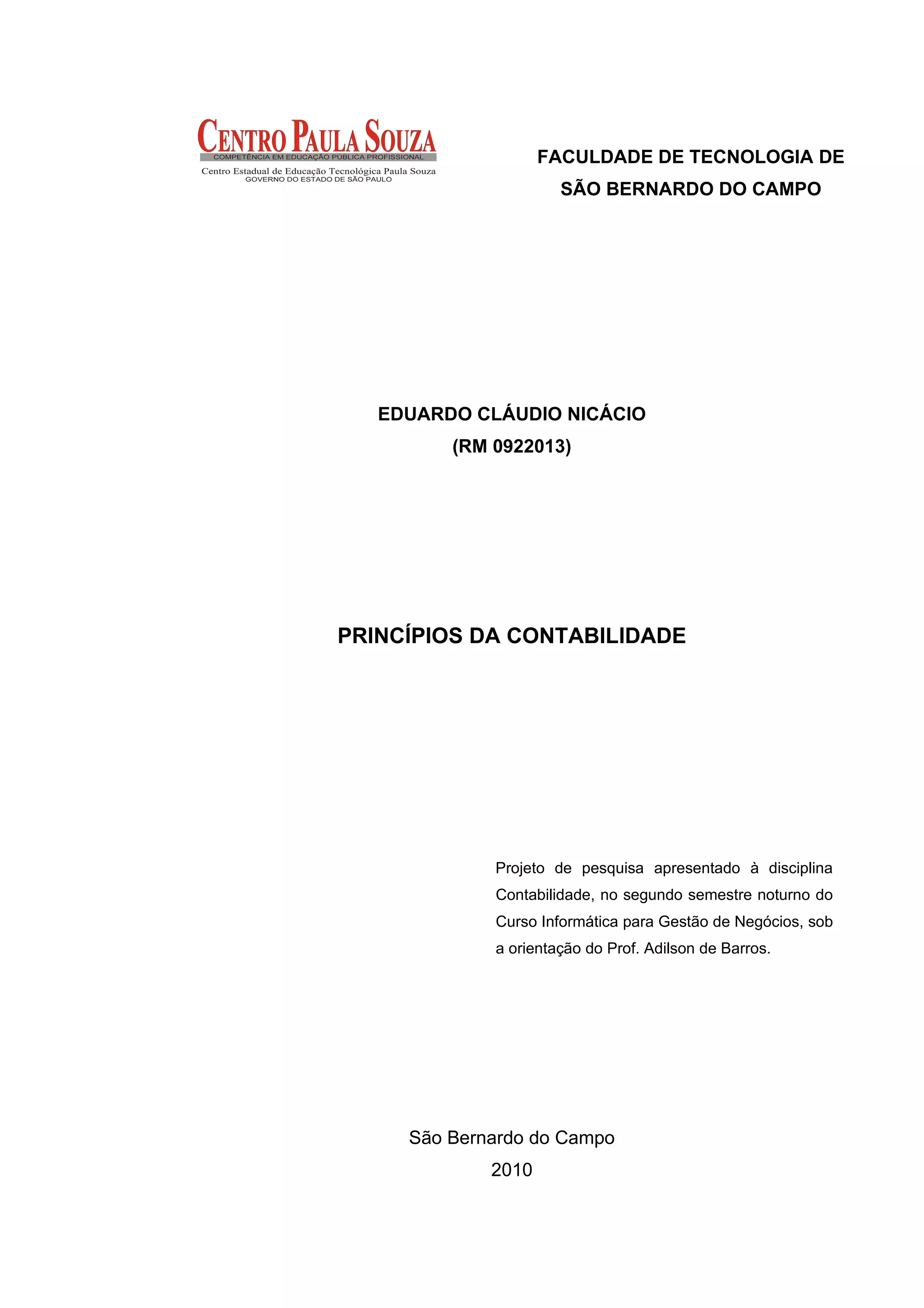 1) O documento apresenta os principais conceitos e princípios da contabilidade, incluindo os princípios fundamentais, conceitos contábeis de bens, direitos, obrigações e patrimônio líquido, e métodos de partidas dobradas. 2) Também discute depreciação e amortização, balanço patrimonial e demonstração de resultados. 3) O documento serve como um projeto de pesquisa sobre os princípios da contabilidade.