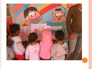 O documento descreve um projeto de 40 horas sobre contação de histórias para crianças de 1 a 3 anos. O objetivo é desenvolver a criatividade, imaginação e comunicação das crianças através do contato com histórias, músicas, pinturas e outras atividades lúdicas.