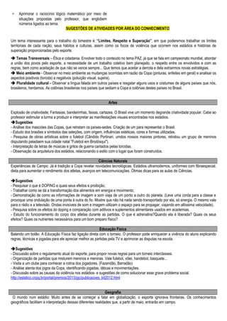 Este documento propõe um projeto interdisciplinar utilizando a Copa do Mundo de Futebol como tema transversal. O projeto visa desenvolver competências nos alunos por meio de pesquisas sobre diversas culturas brasileiras e estrangeiras, além de abordar temas como pluralidade cultural, meio ambiente e ética. Sugere diversas atividades para diferentes áreas do conhecimento relacionadas ao futebol e à Copa.