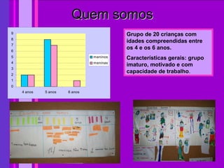 Este documento descreve o projeto curricular de uma turma de crianças entre 4-6 anos. O grupo é imaturo mas motivado. O projeto se concentra no desenvolvimento da autonomia, conceitos matemáticos, consciência fonológica, expressão e comunicação, conhecimento do mundo e formação pessoal e social das crianças. As atividades incluem contar, resolver problemas, escrita, leitura, expressão, pesquisa e cooperação. A avaliação é cooperativa e visa melhorar o desempenho de cada criança com