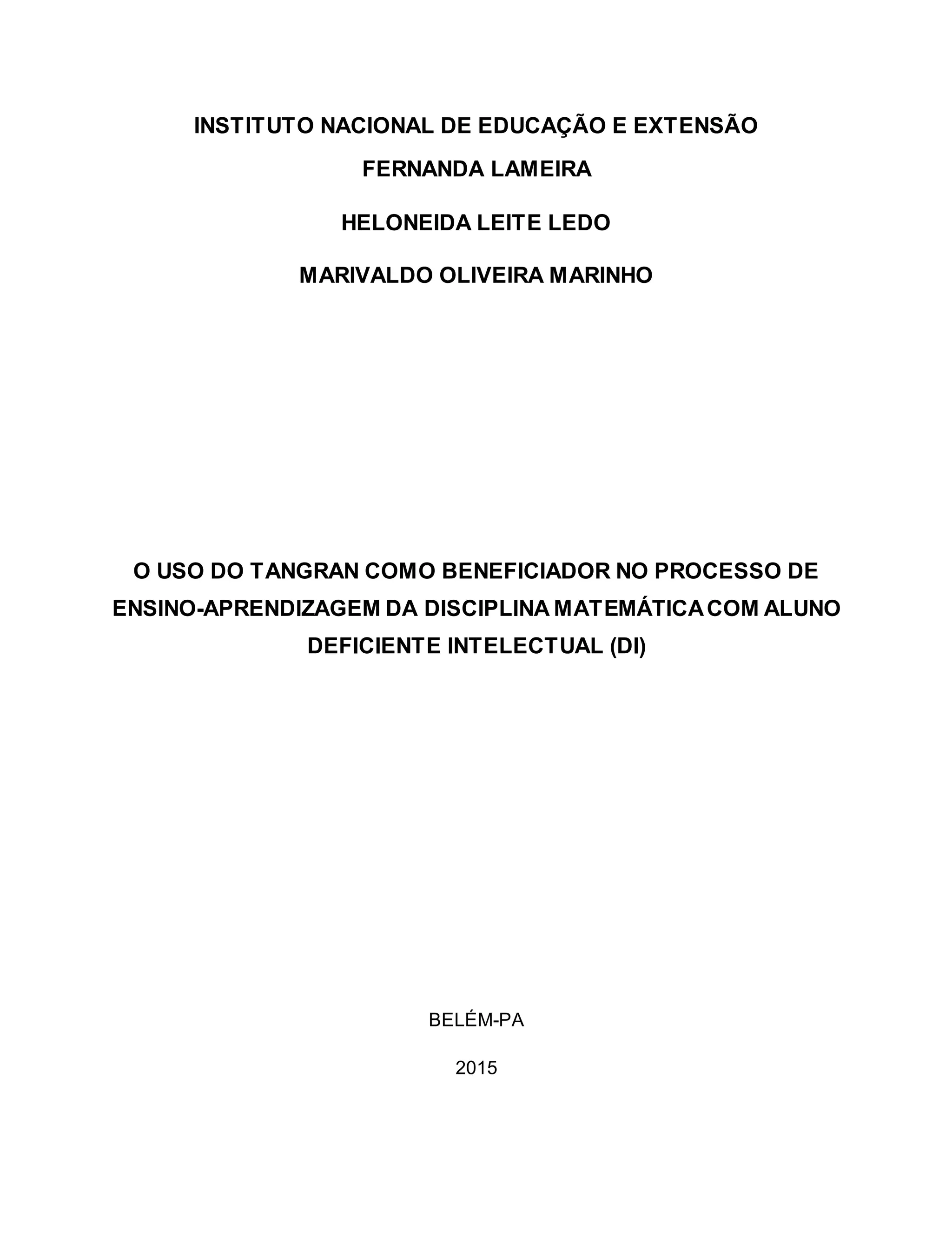 Este documento discute o uso do Tangram como ferramenta pedagógica para desenvolver habilidades matemáticas em alunos com deficiência intelectual. O Tangram é um jogo de sete peças geométricas usado para formar figuras. A pesquisa avaliará se o Tangram pode ajudar esses alunos a aprender conceitos matemáticos de forma lúdica e engajada.