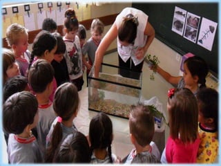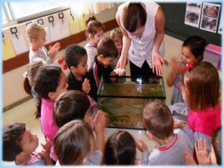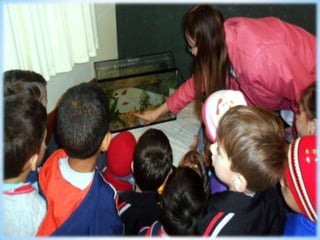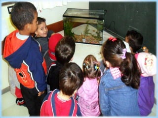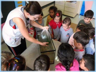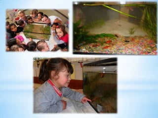 O documento fala sobre organizar pedrinhas e o ajudante do dia cuidando dos peixes diariamente.