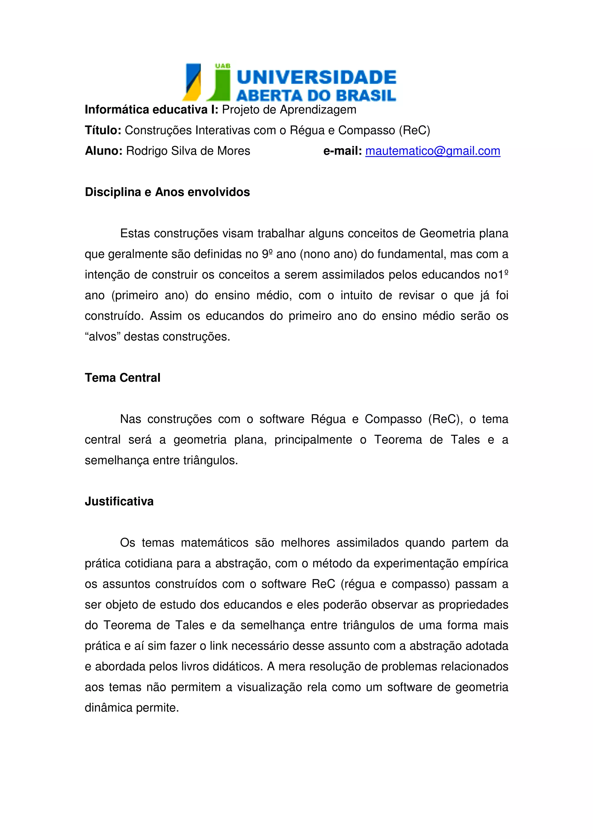 Este documento descreve um projeto de aprendizagem para ensinar conceitos de geometria plana, como o Teorema de Tales e semelhança de triângulos, a estudantes do 1o ano do ensino médio usando o software Régua e Compasso. O projeto será implementado em 3 aulas de 50 minutos cada, dividindo os alunos em duplas para construções no software e resolução de problemas. O objetivo é fornecer uma aprendizagem prática e experimental destes conceitos.