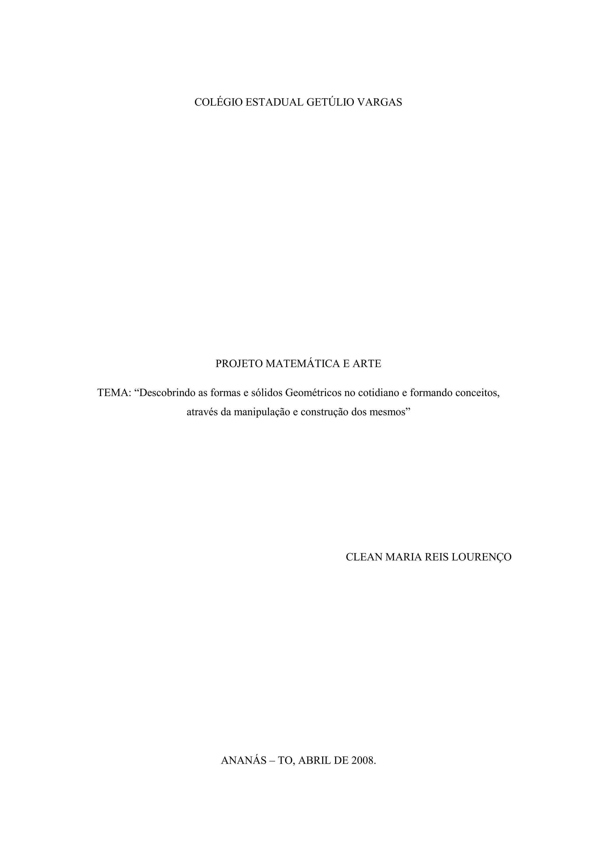 Este documento descreve um projeto interdisciplinar entre matemática e arte em uma escola no Tocantins. O projeto visa ajudar os alunos a entender formas e sólidos geométricos através de atividades práticas e criativas como construção de figuras com Tangram, mosaicos e sólidos geométricos com papel e palitos. O projeto será implementado nas aulas de 1o a 9o ano para melhorar a compreensão dos alunos sobre geometria.