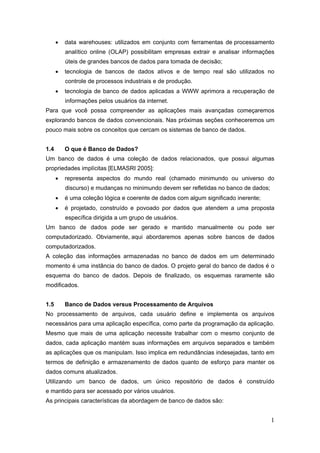 1. O documento introduz os conceitos básicos de projeto de banco de dados, incluindo as etapas de projeto, modelos de dados, sistemas de banco de dados e pessoas envolvidas.