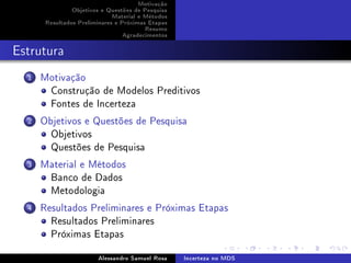 O documento aborda a construção de modelos preditivos para caracterizar a incerteza no mapeamento digital do solo (MDS) e sua dependência de diferentes fatores, como a calibração de dados e co-variáveis ambientais. Os principais objetivos incluem a avaliação de fontes de incerteza e a determinação da eficácia de métodos de seleção de variáveis em diferentes cenários de dados. Resultados preliminares e próximos passos são delineados para avançar na pesquisa sobre a acurácia preditiva em modelos lineares e não-lineares.