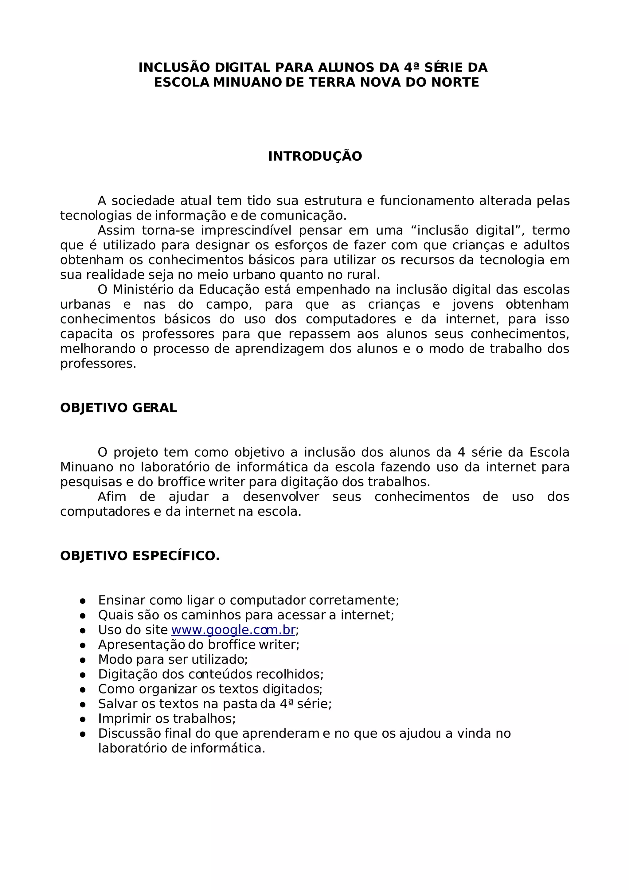 O documento descreve um projeto de inclusão digital para alunos da 4a série da Escola Minuano de Terra Nova do Norte que visa ensinar os alunos a usar computadores e a internet para pesquisas e digitação de trabalhos escolares.