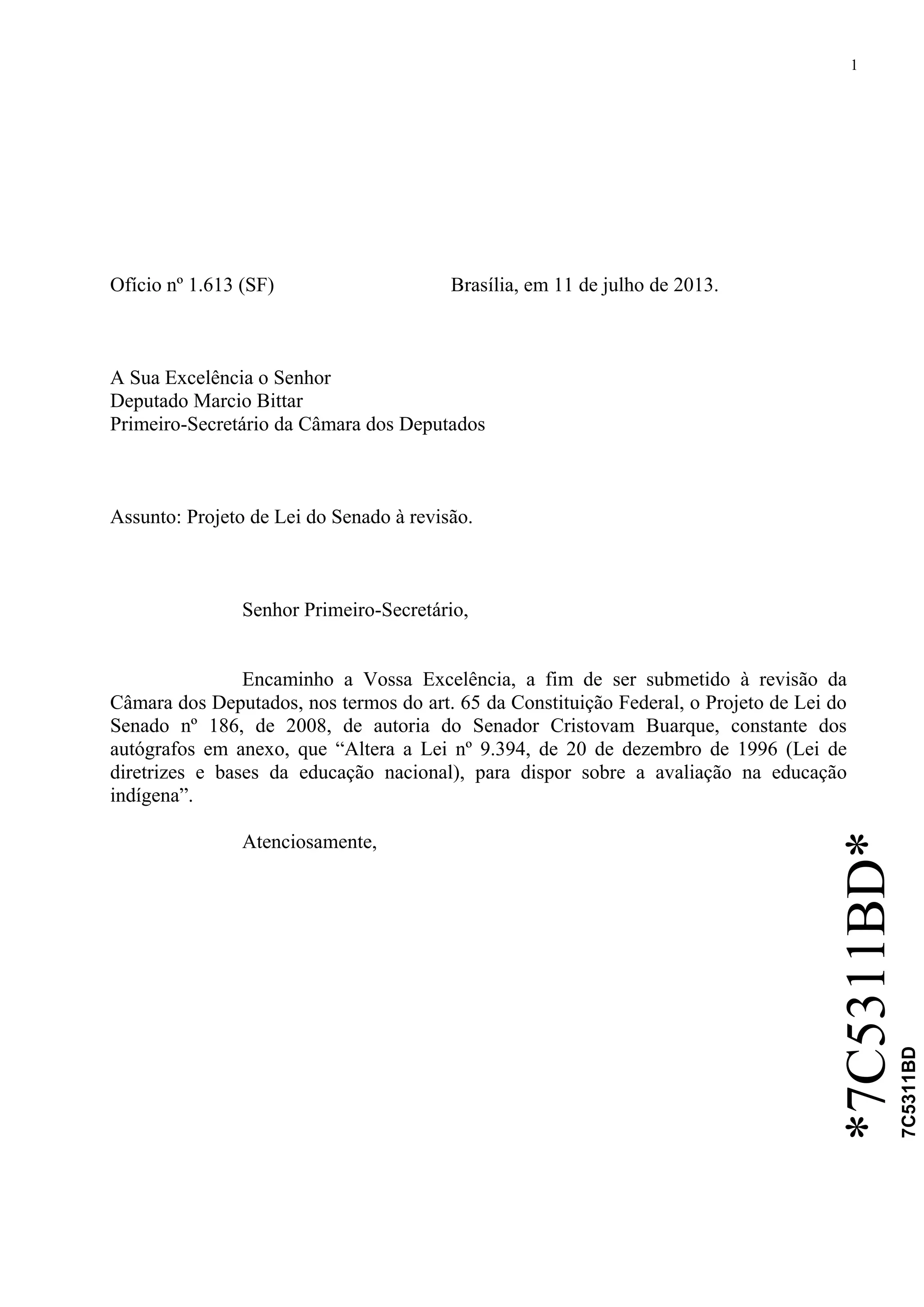 O documento é um ofício enviado ao Primeiro-Secretário da Câmara dos Deputados encaminhando um Projeto de Lei do Senado de 2008 para revisão. O Projeto de Lei propõe alterações na Lei de Diretrizes e Bases da Educação Nacional para assegurar o uso de línguas maternas e processos próprios de aprendizagem e avaliação nas comunidades indígenas.