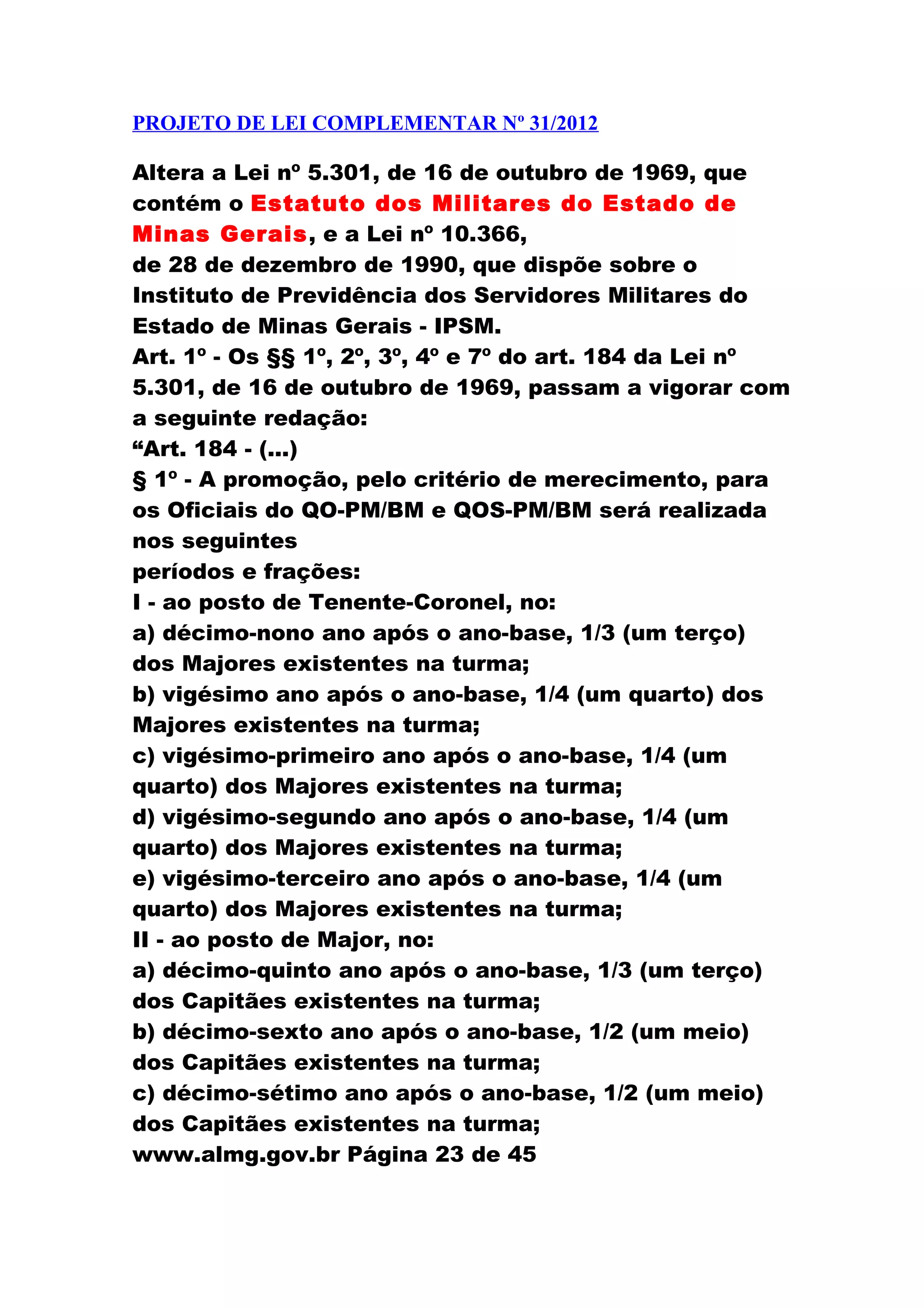 Este projeto de lei complementar propõe alterações na legislação que trata dos militares e servidores militares do estado de Minas Gerais, modificando regras sobre promoção, tempo de serviço e contribuições para o instituto de previdência dos militares.