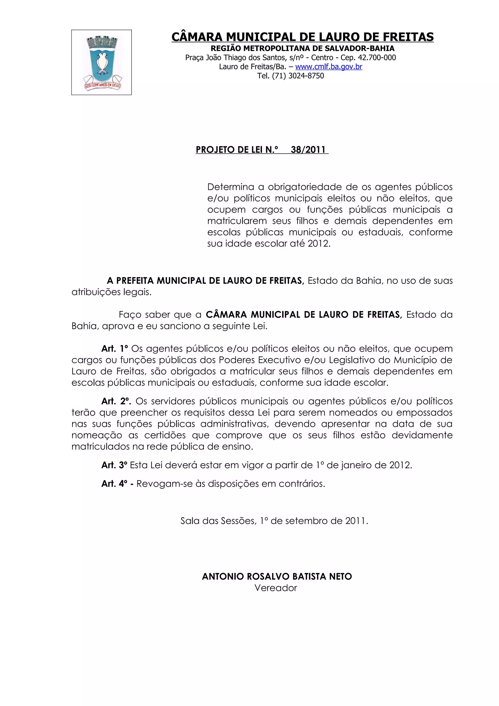 O Projeto de Lei nº 38/2011 exige que agentes públicos de Lauro de Freitas matriculem seus filhos em escolas públicas até 2012. O objetivo é promover a ética e a responsabilidade dos representantes com a educação pública, além de evitar deduções fiscais para educação privada. A proposta visa melhorar a qualidade das escolas públicas no Brasil e estabelecer um compromisso com a educação do povo.