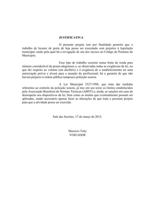 Este projeto de lei acrescenta um inciso à lei municipal para permitir que locutores de propaganda em lojas trabalhem legalmente, desde que cumpram requisitos como alvará anual e comunicação prévia. Também altera outro artigo para permitir essa atividade, revogando dispositivo em contrário. A justificativa é que isso gera renda e não causará poluição sonora se cumpridas as normas sobre volume.