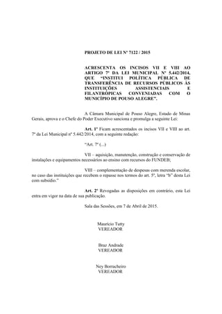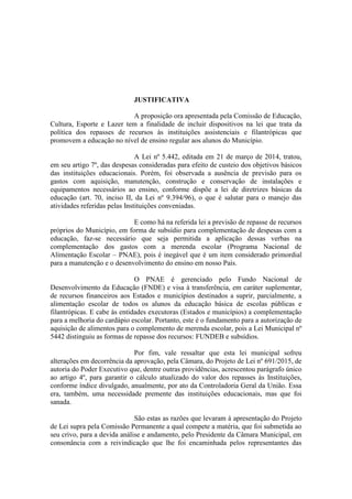 Este projeto de lei acrescenta dois incisos à Lei Municipal no 5.442/2014 de Pouso Alegre para permitir o uso de recursos públicos por instituições de ensino conveniadas para a aquisição e manutenção de equipamentos educacionais e para complementar despesas com merenda escolar.