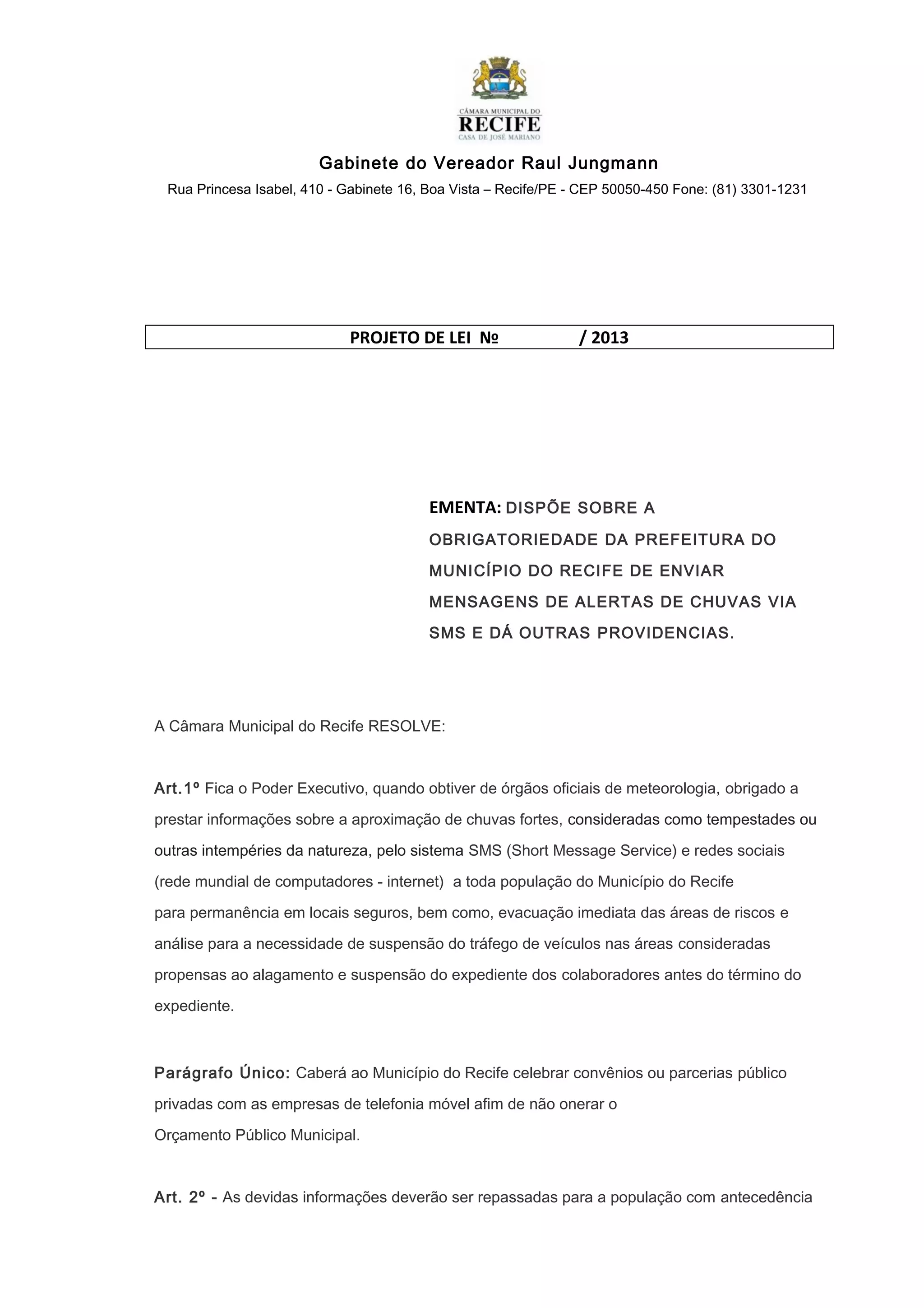 O projeto de lei obriga a prefeitura do Recife a enviar alertas de chuvas fortes via SMS à população com antecedência mínima de 24 horas. A prefeitura deverá criar um grupo coordenador para reunir informações de risco de enchentes de diferentes regiões e planejar a gestão de riscos. O objetivo é minorar os transtornos causados pelas chuvas de verão na cidade através de uma comunicação rápida e efetiva.