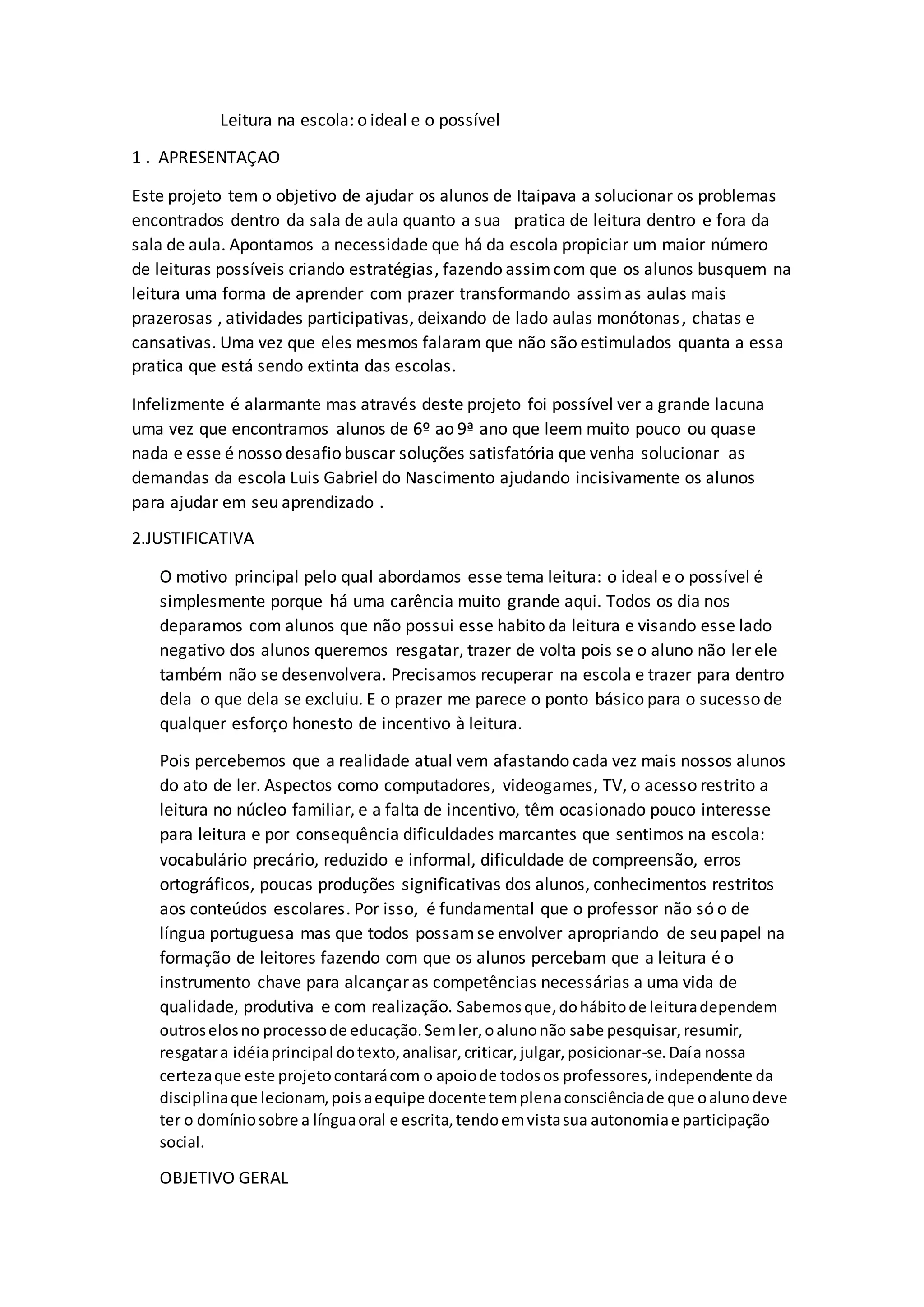 Este documento descreve um projeto para promover a leitura entre alunos do 6o ao 9o ano de uma escola em Itaipava. O projeto tem como objetivo principal estimular o prazer pela leitura, escrita e compreensão de textos através de estratégias como um dia semanal dedicado à leitura, concursos de redação e palestras sobre a importância da leitura.