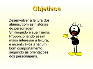 O projeto de leitura desenvolvido pela professora Adriana para alunos do 2o ano teve como objetivo desenvolver as habilidades de leitura dos estudantes usando histórias do personagem Smilinguido. Ao longo do ano letivo, os alunos tiveram acesso a diferentes mídias com o personagem para incentivar o bom comportamento e interesse pela leitura.