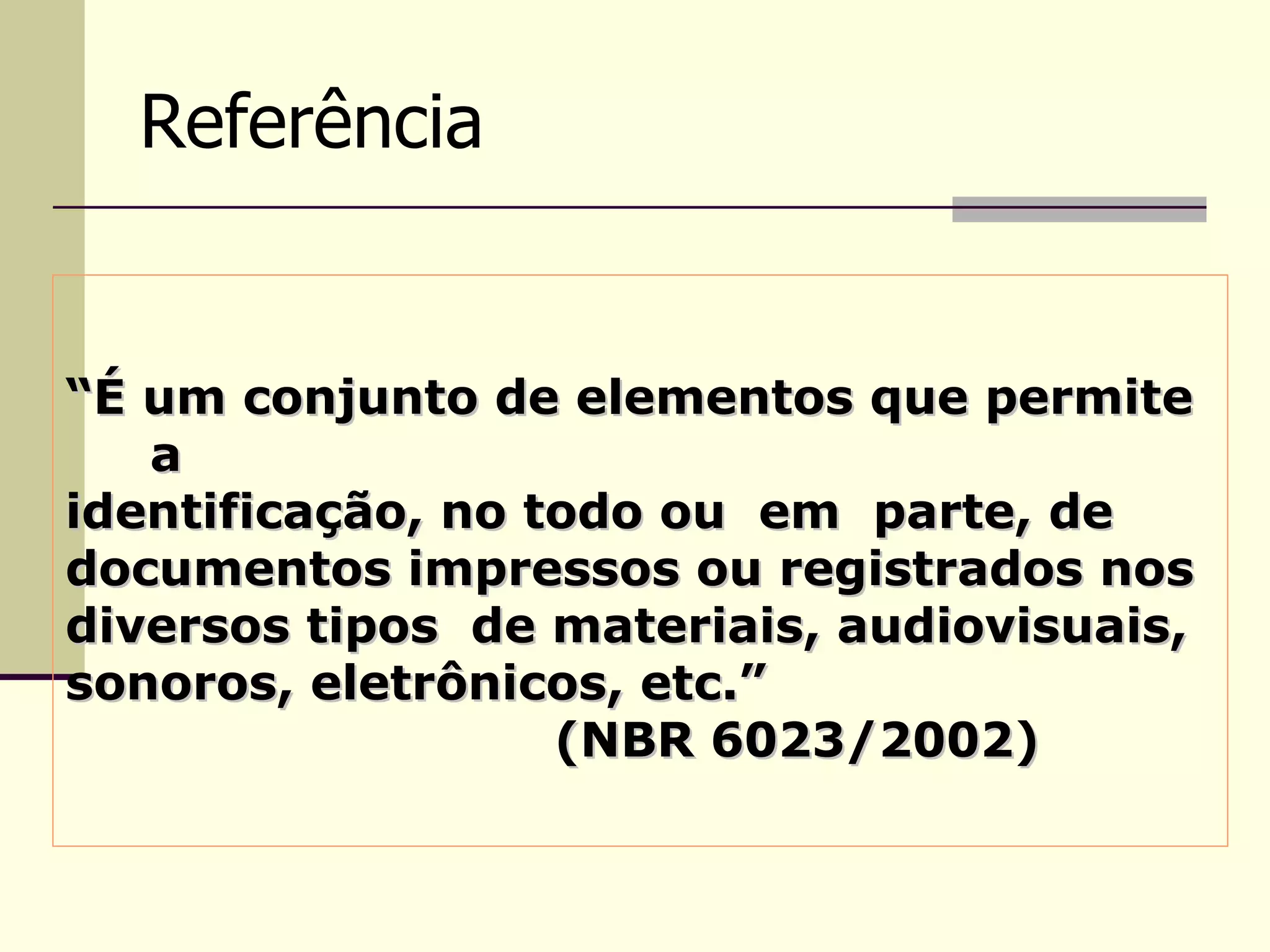 O documento descreve as regras para referenciar diferentes tipos de fontes como livros, teses, capítulos de livros, documentos online e artigos de periódicos e jornais. Detalha como devem ser apresentados elementos como autor, título, local, editora e páginas de acordo com o número de autores e tipo de material. Também especifica o uso de maiúsculas e formatação como margem e espaçamento das referências.
