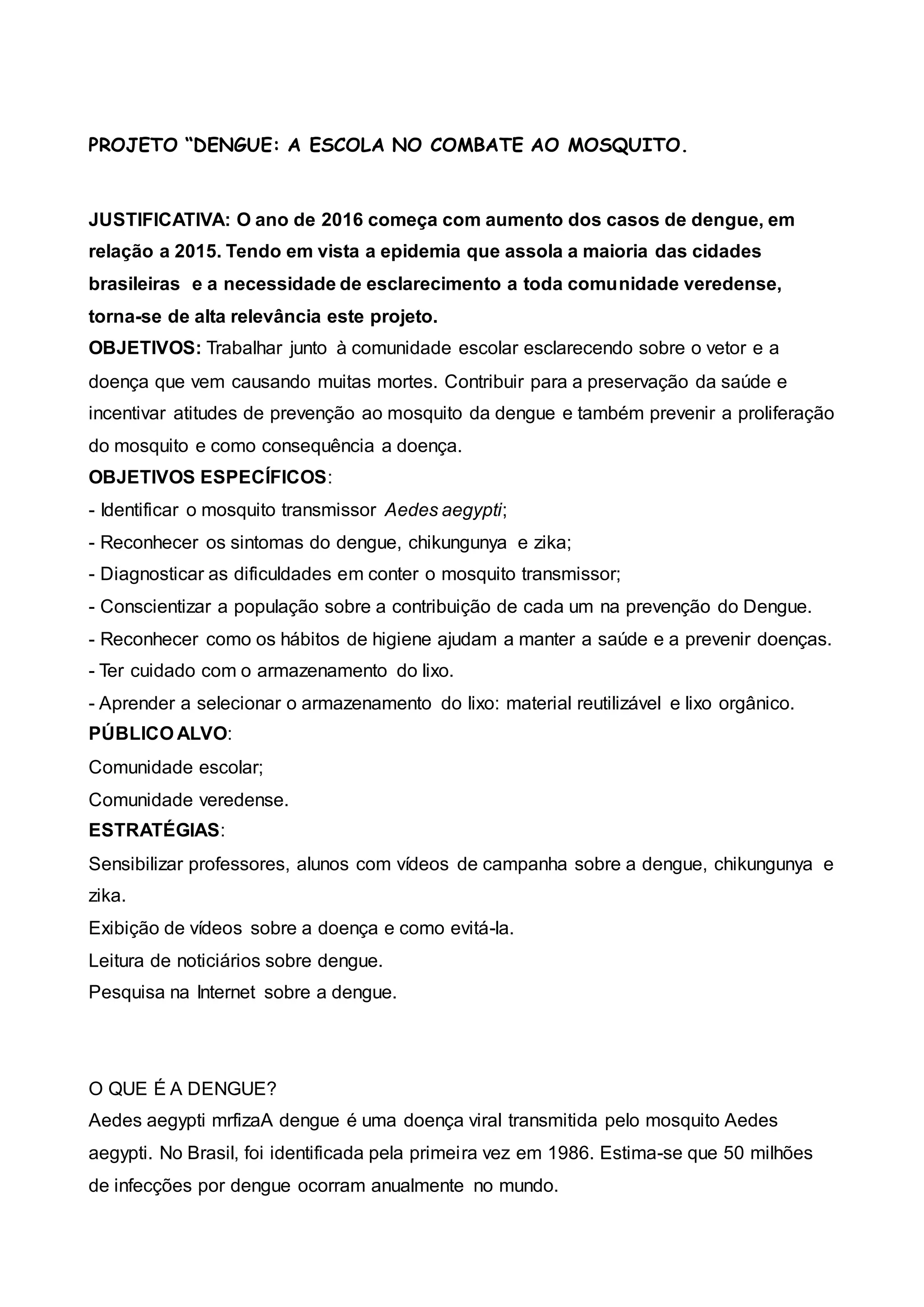 O documento discute um projeto para combater o mosquito da dengue nas escolas. O projeto visa esclarecer a comunidade escolar sobre o vetor da dengue, o mosquito Aedes aegypti, e incentivar atitudes de prevenção. Ele aborda como a dengue é transmitida, seus sintomas, tratamento e formas de prevenção, como eliminar possíveis criadouros do mosquito.