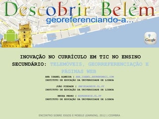 O documento discute um projeto que ensinou alunos do ensino secundário a usar tecnologias móveis como georreferenciação e criação de páginas web. Os alunos georreferenciaram pontos turísticos e criaram um site sobre Belem usando estas ferramentas. O projeto objetivou inovar o currículo de TIC e mostrar a utilidade destas tecnologias.