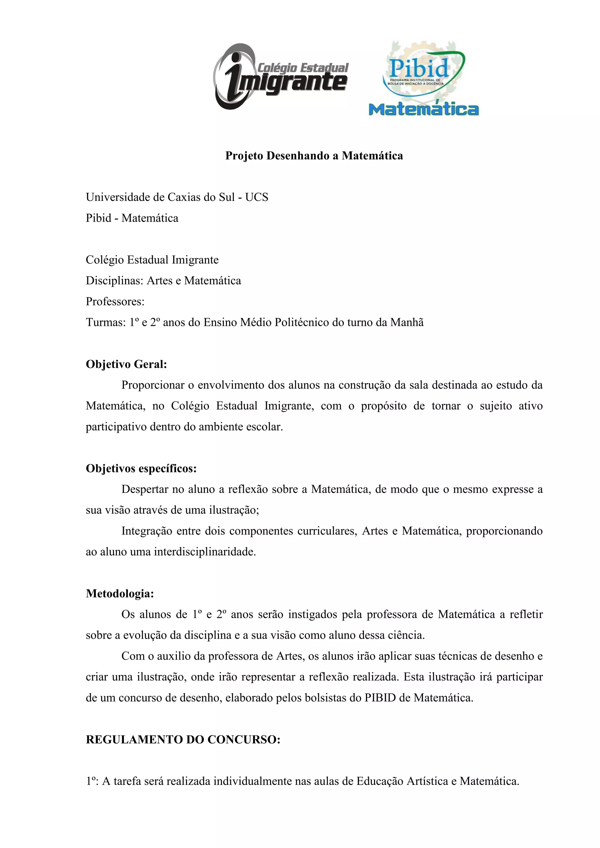 Este projeto propõe que alunos do ensino médio desenhem ilustrações sobre matemática para decorar a sala de aula, promovendo a integração entre artes e matemática. Os 20 melhores desenhos serão selecionados e um será escolhido como vencedor de um concurso.