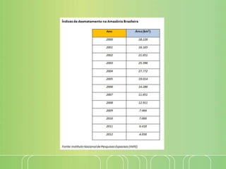 O documento descreve um projeto pedagógico de 9 dias sobre desmatamento para alunos do 4o ano do ensino fundamental. O projeto usará vídeos, livros, passeios e debates para ensinar sobre as causas e consequências do desmatamento e promover a conscientização ambiental.