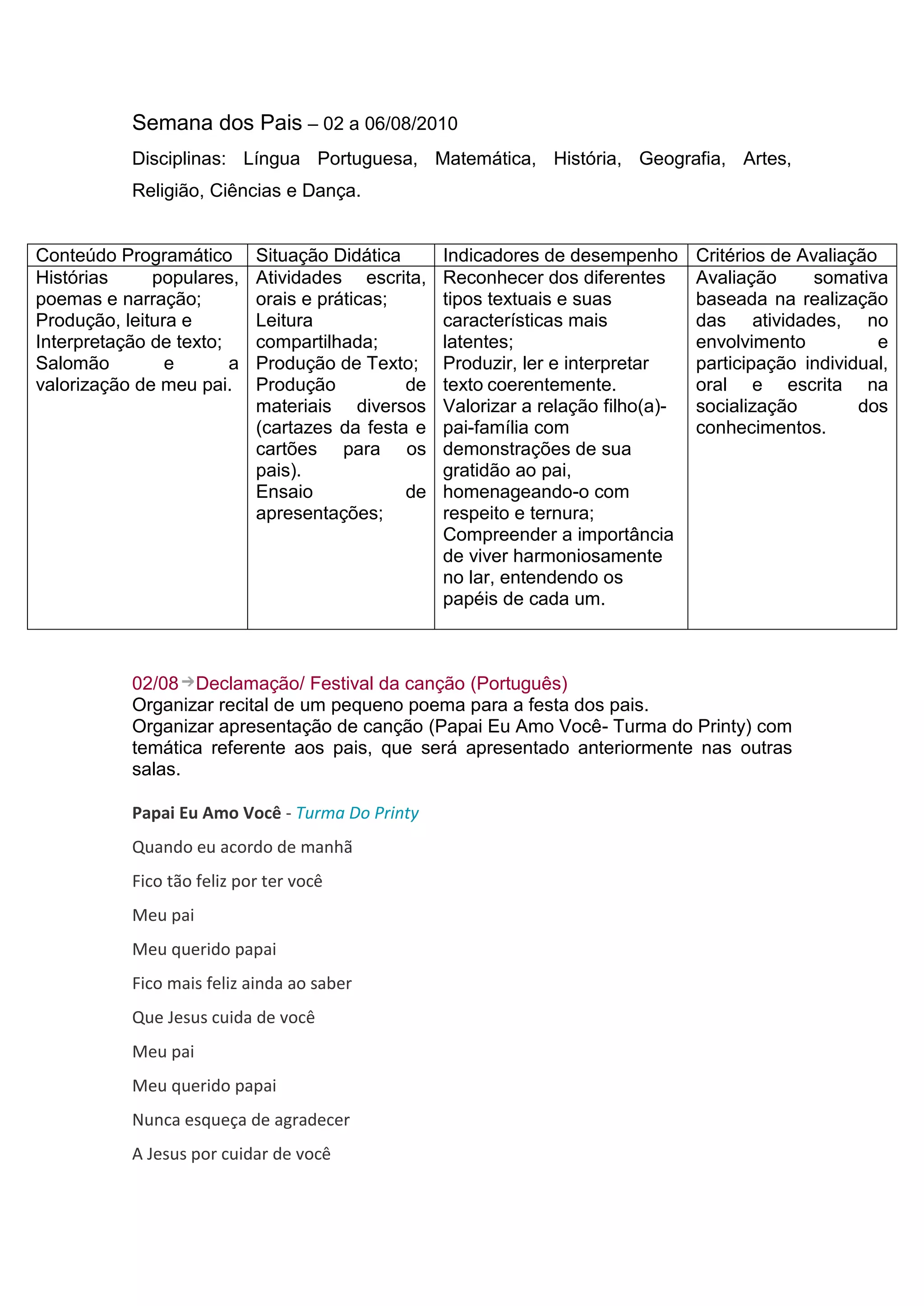A semana de 2 a 6 de agosto será dedicada à Semana dos Pais, com atividades nas disciplinas de Língua Portuguesa, Matemática, História, Geografia, Artes, Religião, Ciências e Dança. As atividades incluem poesias, músicas, pesquisas e entrevistas sobre os pais para valorizar a relação entre pais e filhos.