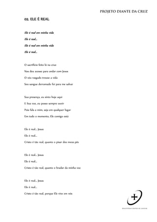 Este documento contém 12 músicas cristãs de adoração e louvor a Deus. As músicas celebram a bondade de Deus, Sua presença real na vida dos crentes, Jesus como o justo Rei, o grande amor de Deus mostrado na cruz, o desejo de se entregar completamente a Deus e Sua palavra, e a fé no Senhor como a única fortaleza e refúgio.