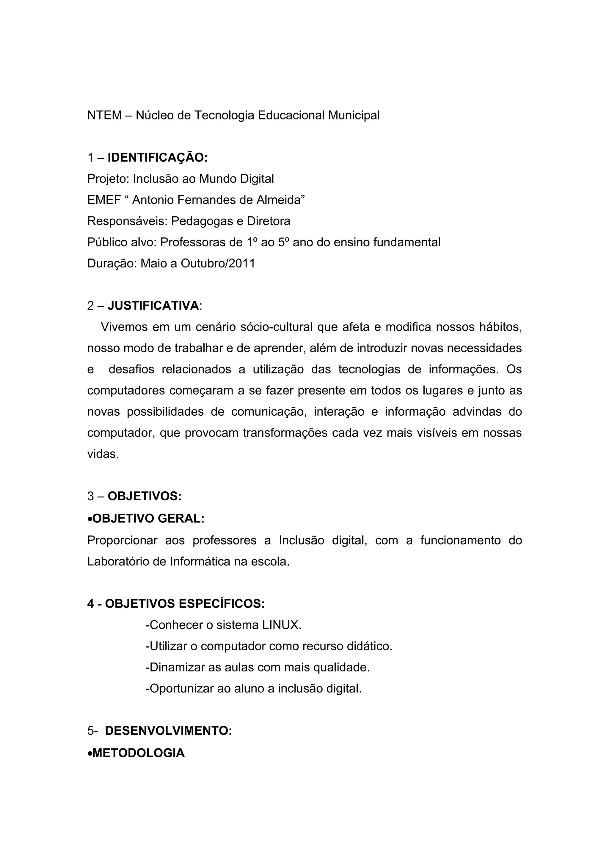 O documento descreve um projeto de inclusão digital para professores de uma escola municipal. O projeto tem como objetivo principal proporcionar aos professores a inclusão digital através do funcionamento de um laboratório de informática na escola. Os professores participarão de treinamentos individuais para aprender a usar o sistema Linux e computadores como recursos didáticos em suas aulas. O projeto ocorrerá de maio a outubro de 2011.