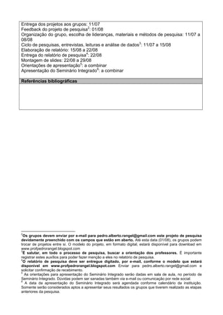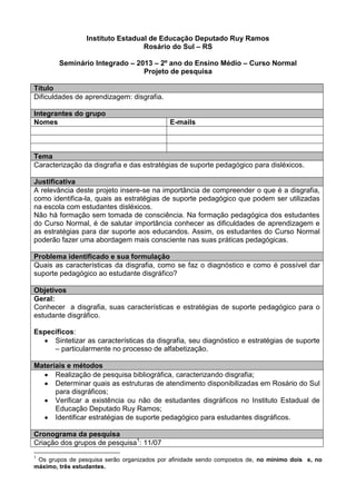Este documento descreve um projeto de pesquisa sobre disgrafia realizado por estudantes do Curso Normal. O projeto visa caracterizar a disgrafia, seu diagnóstico e estratégias de suporte pedagógico, particularmente no processo de alfabetização. Os estudantes irão realizar pesquisa bibliográfica, identificar estruturas de atendimento locais e estratégias de apoio para disgráficos. O cronograma inclui elaboração de relatório e apresentação dos resultados em seminário.
