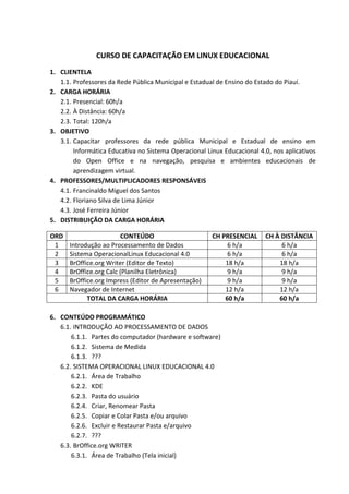 1) O documento descreve um curso de capacitação em Linux Educacional oferecido pela Secretaria de Educação do Piauí para professores da rede pública.