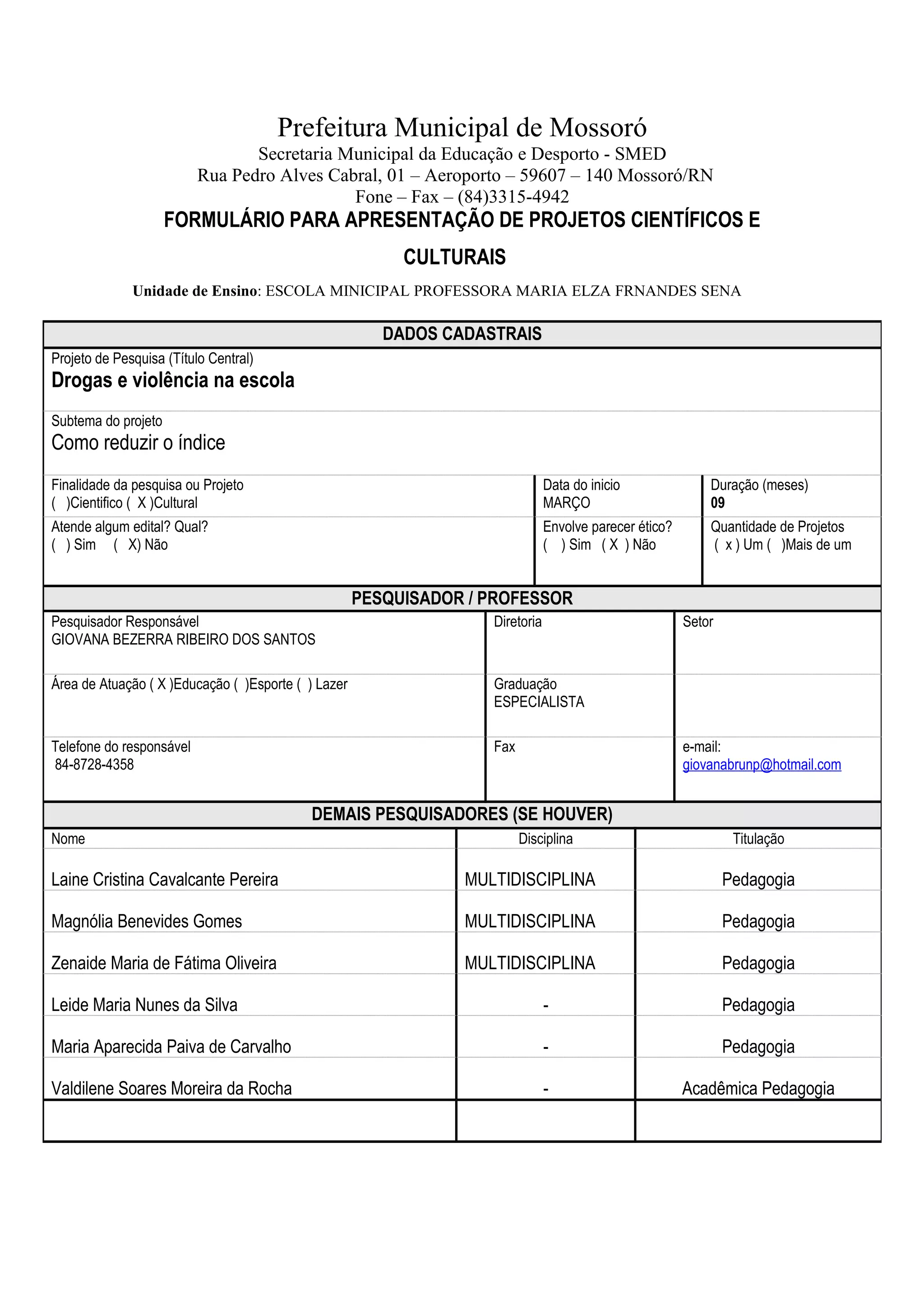 O projeto visa trabalhar temas como drogas, violência na escola e formas de prevenção. Serão realizadas pesquisas, discussões em grupo e palestras com alunos e comunidade sobre os tipos de violência, drogas e seus efeitos. Espera-se conscientizar a comunidade escolar e reduzir índices de violência e uso de drogas por meio de cartazes, panfletos e banner.