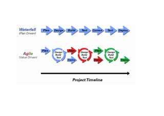 O documento discute as etapas do desenvolvimento de software, incluindo: 1) Reunião com o cliente para entender os requisitos; 2) Especificação formal dos requisitos; 3) Desenvolvimento do código e teste. O processo é guiado por metodologias como Scrum e Kanban através de reuniões de planejamento.