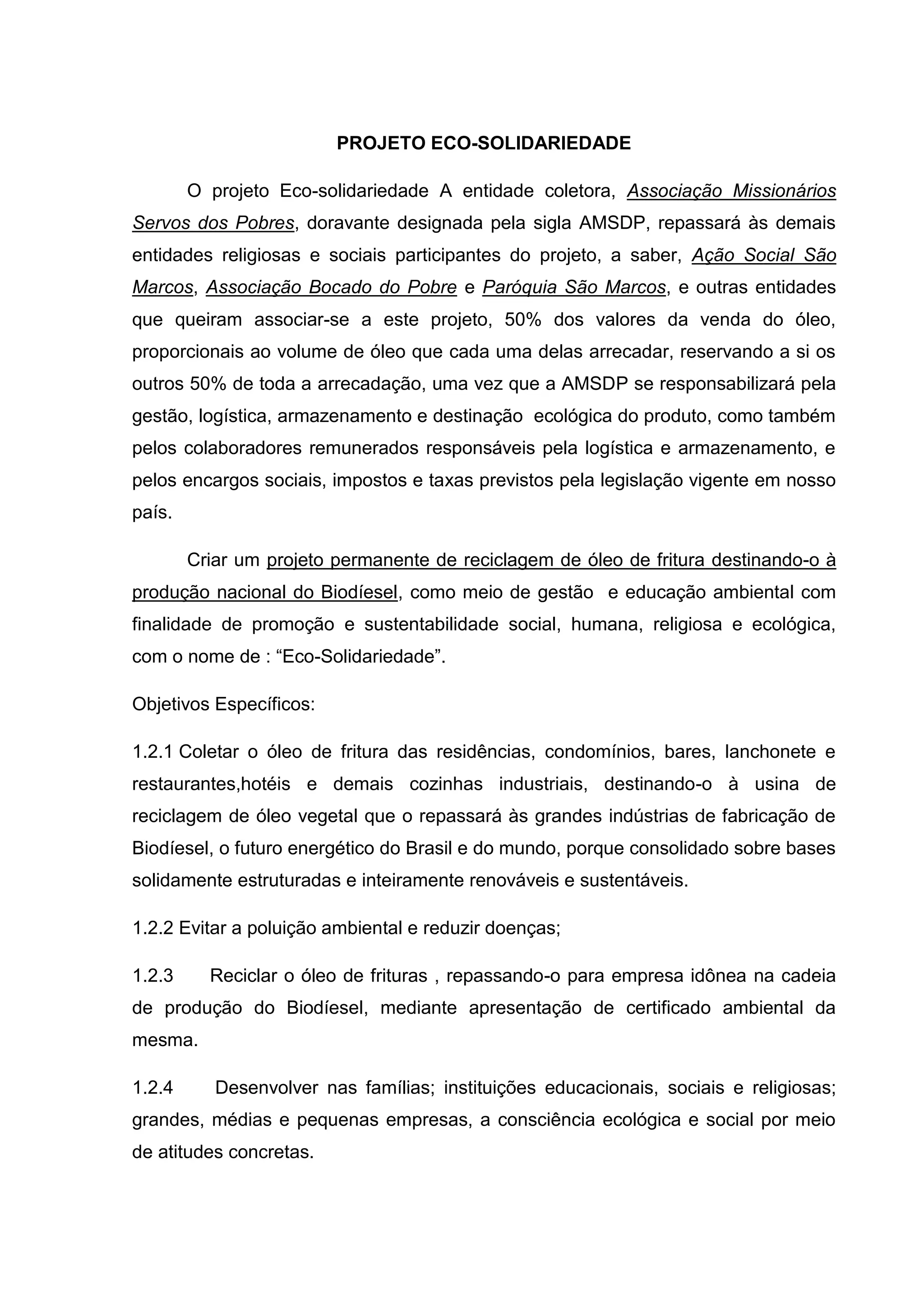 O documento descreve um projeto de reciclagem de óleo de cozinha usado chamado Eco-Solidariedade. O projeto visa coletar óleo usado de residências e empresas para reciclagem e produção de biodiesel, promovendo educação ambiental e sustentabilidade social e ecológica. A Associação Missionários Servos dos Pobres gerenciará o projeto e repassará metade da receita às outras entidades participantes.