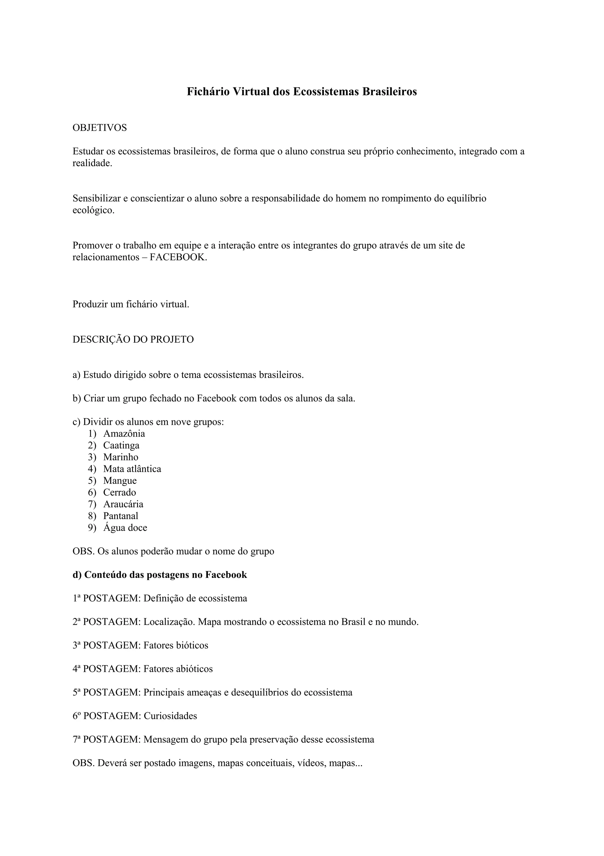 Este documento descreve um projeto para estudar os ecossistemas brasileiros através da criação de um grupo no Facebook onde os alunos, divididos em subgrupos, postarão informações sobre diferentes ecossistemas brasileiros como a Amazônia, Caatinga, Mata Atlântica e Pantanal.