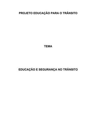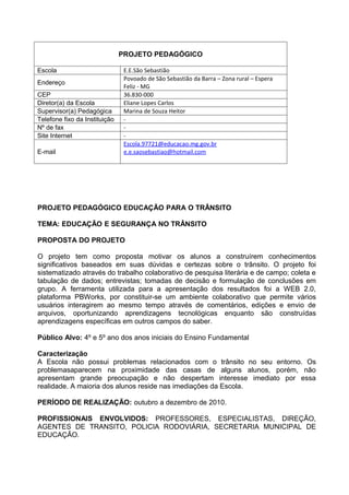 O documento descreve um projeto de educação para o trânsito realizado por uma escola rural em Minas Gerais. O projeto teve como objetivo motivar os alunos a construírem conhecimentos sobre trânsito por meio de pesquisas, entrevistas e atividades colaborativas utilizando a plataforma PBWorks. O projeto envolveu alunos dos 4o e 5o anos respondendo perguntas sobre sinalização, legislação e segurança no trânsito.