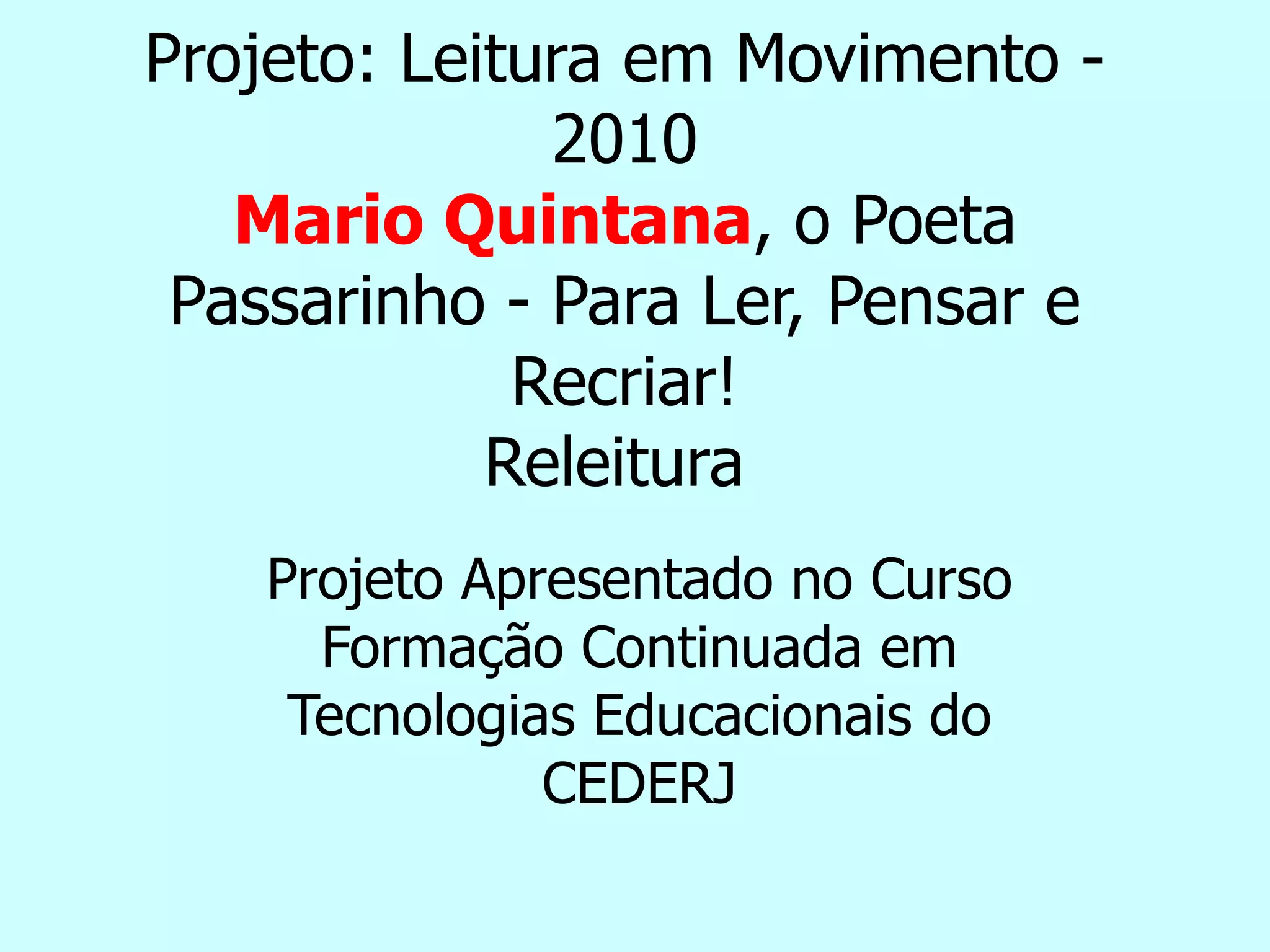 O projeto tem como objetivo promover o contato de alunos com a obra do poeta Mario Quintana. Os alunos irão conhecer a vida e obra de Quintana, escrever uma releitura coletiva de uma de suas poesias e participar de um concurso de releituras promovido pela prefeitura. Ferramentas da Web 2.0 como Google Docs e YouTube serão utilizadas para compartilhamento de informações sobre o projeto entre as escolas participantes.