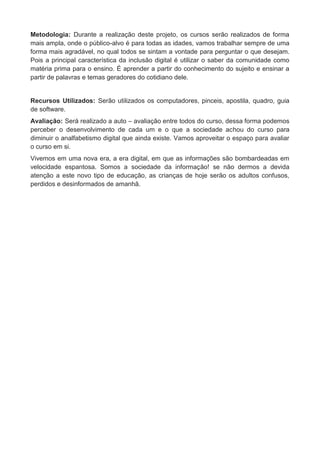 Este projeto visa promover a inclusão digital do conselho gestor da cidade de Nova Timboteua através de cursos de informática gratuitos para a população. Os cursos serão realizados por três meses em 2012 para todas as idades com o objetivo de qualificar profissionalmente pessoas sem condições financeiras e incluí-los no mundo digital. Os conteúdos incluem editor de texto, planilhas, apresentações e redes sociais.