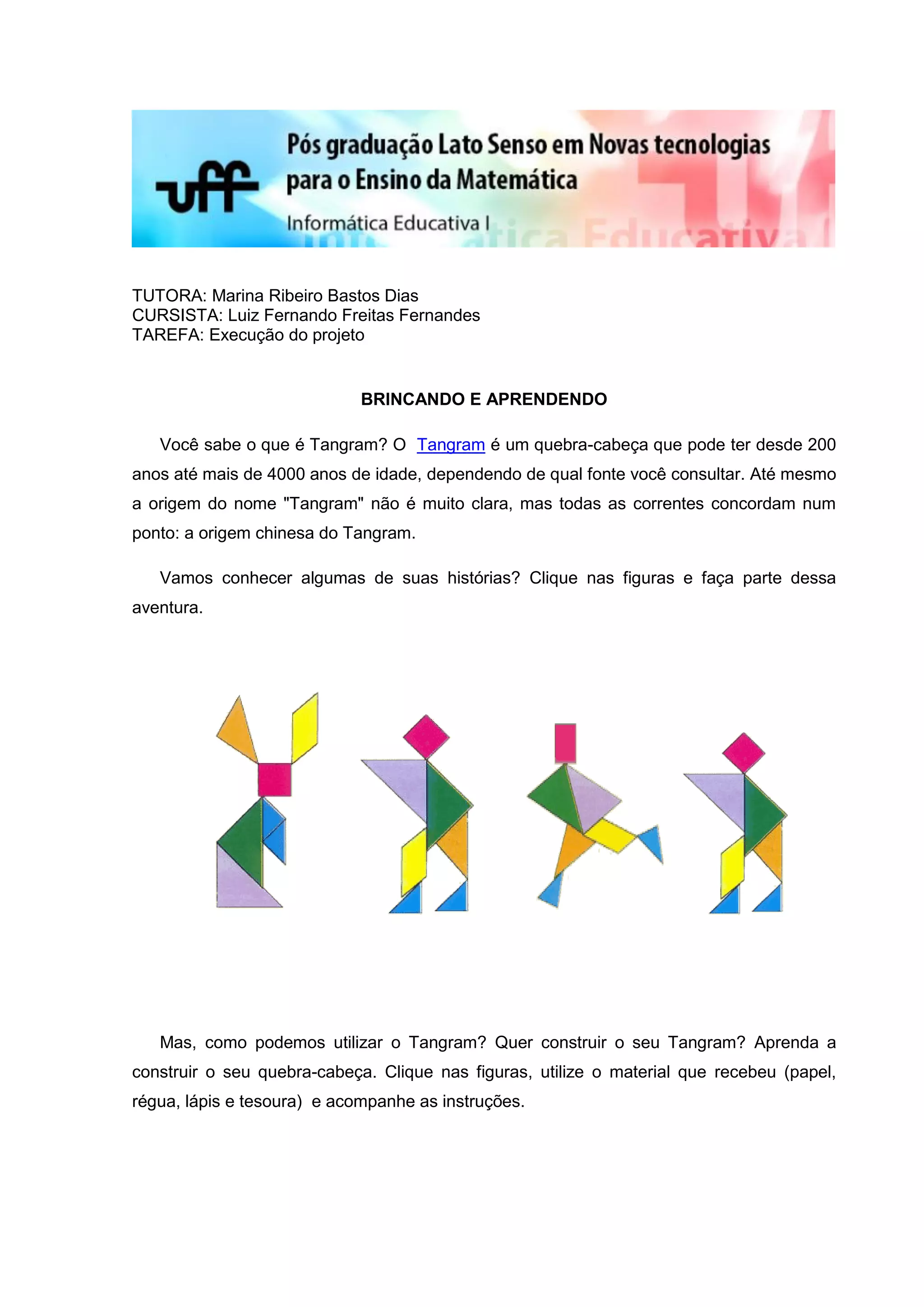 O documento apresenta um projeto educacional sobre o Tangram, um quebra-cabeça chinês antigo. O projeto ensina sobre a história e construção do Tangram, desafia os alunos a formarem figuras geométricas com as peças e calcularem áreas. Inclui atividades e links para aprofundar o aprendizado de forma lúdica.