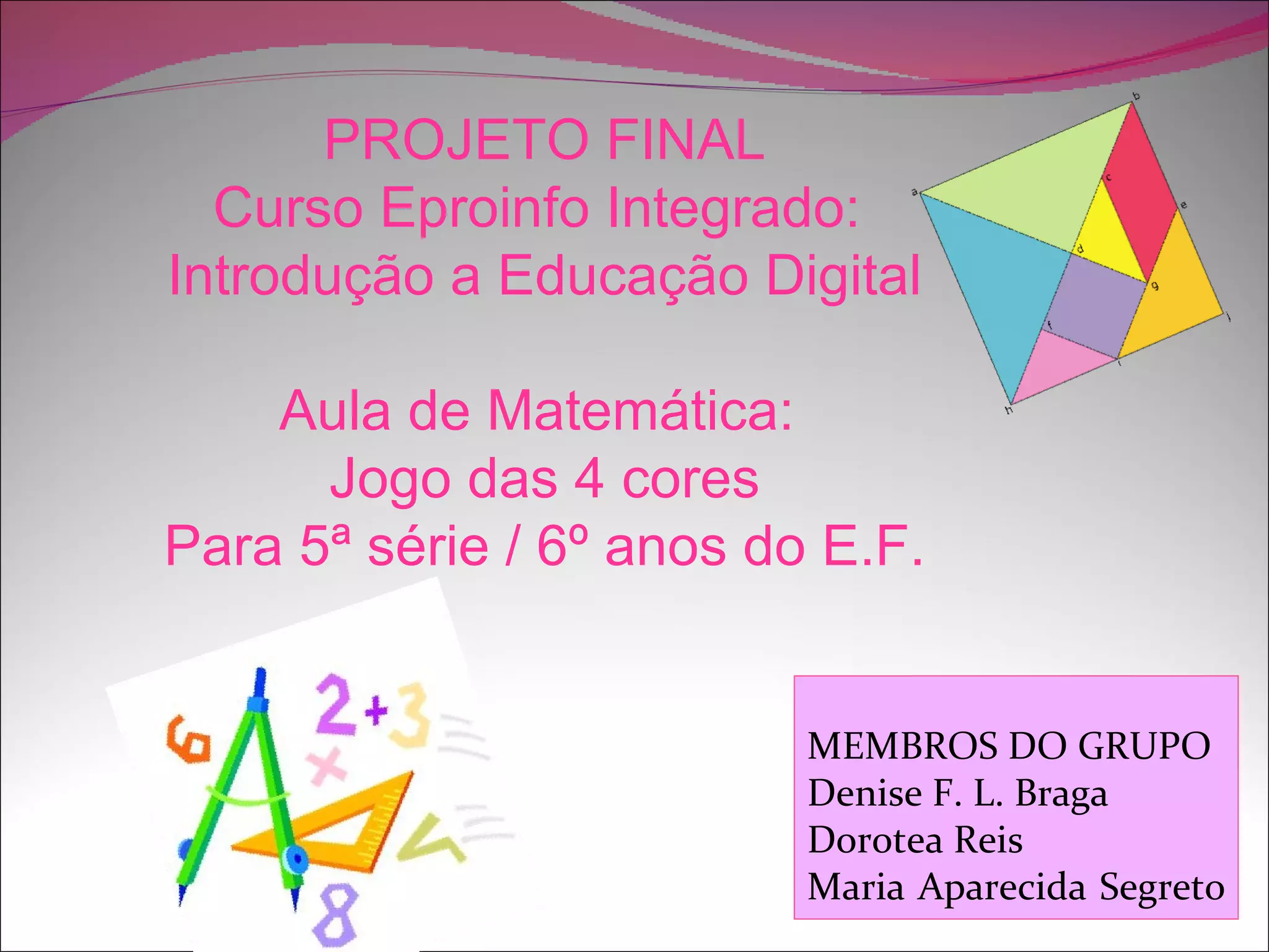 PROJETO FINAL Curso Eproinfo Integrado: Introdução a Educação Digital Aula de Matemática: Jogo das 4 cores Para 5ª série / 6º anos do E.F. MEMBROS DO GRUPO Denise F. L. Braga Dorotea Reis Maria Aparecida Segreto