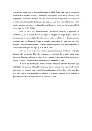 O documento discute a relação entre educação física e psicomotricidade. A psicomotricidade surgiu na Grécia antiga e se refere ao movimento do corpo e da alma. A educação física é essencial para o desenvolvimento motor e a relação professor-aluno deve ser abrangente. As atividades lúdicas desenvolvem emoções, espaço e ritmo nas crianças. A educação física deve considerar o aluno de forma holística.