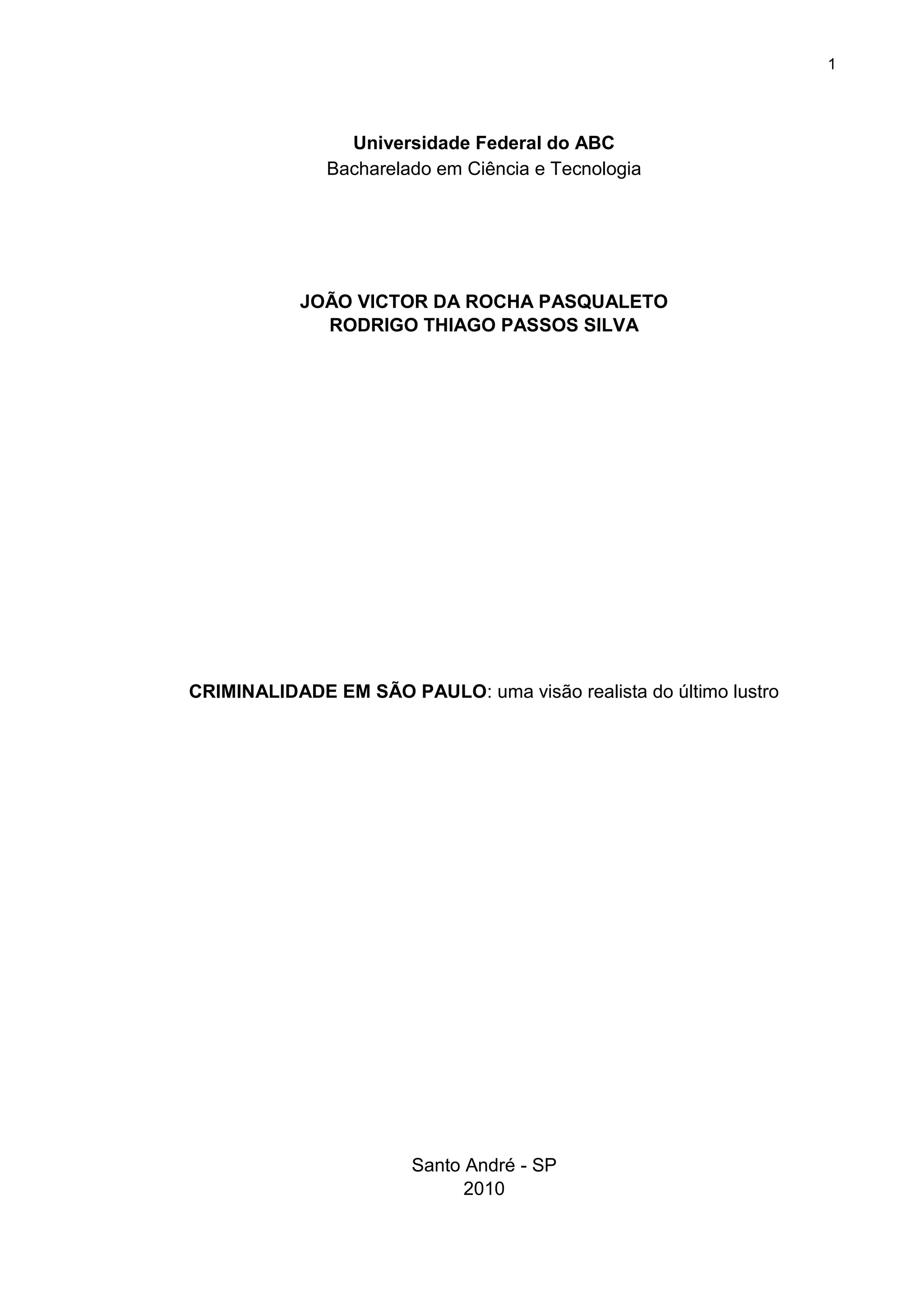 O documento apresenta um estudo estatístico sobre a criminalidade na cidade de São Paulo nos últimos 5 anos. Os principais resultados mostram que: (1) os homicídios dolosos tiveram uma média de 424,6 por trimestre com tendência de queda; (2) os roubos apresentaram alta variabilidade com tendência de queda; (3) as prisões efetuadas e armas apreendidas tiveram correlação positiva com os homicídios e roubos. O documento analisa vários outros crimes e atividades policiais.