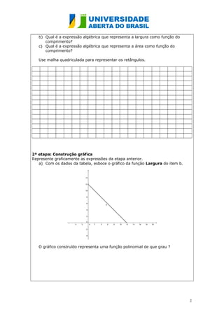 Este projeto ensina sobre funções quadráticas através de um observatório de parábolas. Os alunos irão completar tabelas, construir gráficos e resolver problemas envolvendo comprimento, largura e área de retângulos para entender melhor as expressões algébricas e representações gráficas de funções do segundo grau.