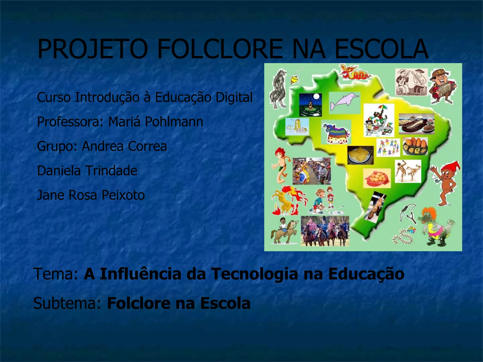 Este projeto visa resgatar e valorizar manifestações da cultura popular brasileira nas escolas através de atividades lúdicas e educativas que relacionam o folclore com o cotidiano atual, envolvendo alunos, famílias e a comunidade escolar. O projeto utilizará recursos tecnológicos e métodos como pesquisas, jogos, vídeos e produções artísticas para ensinar sobre lendas, músicas, brincadeiras e outros elementos do folclore brasileiro.
