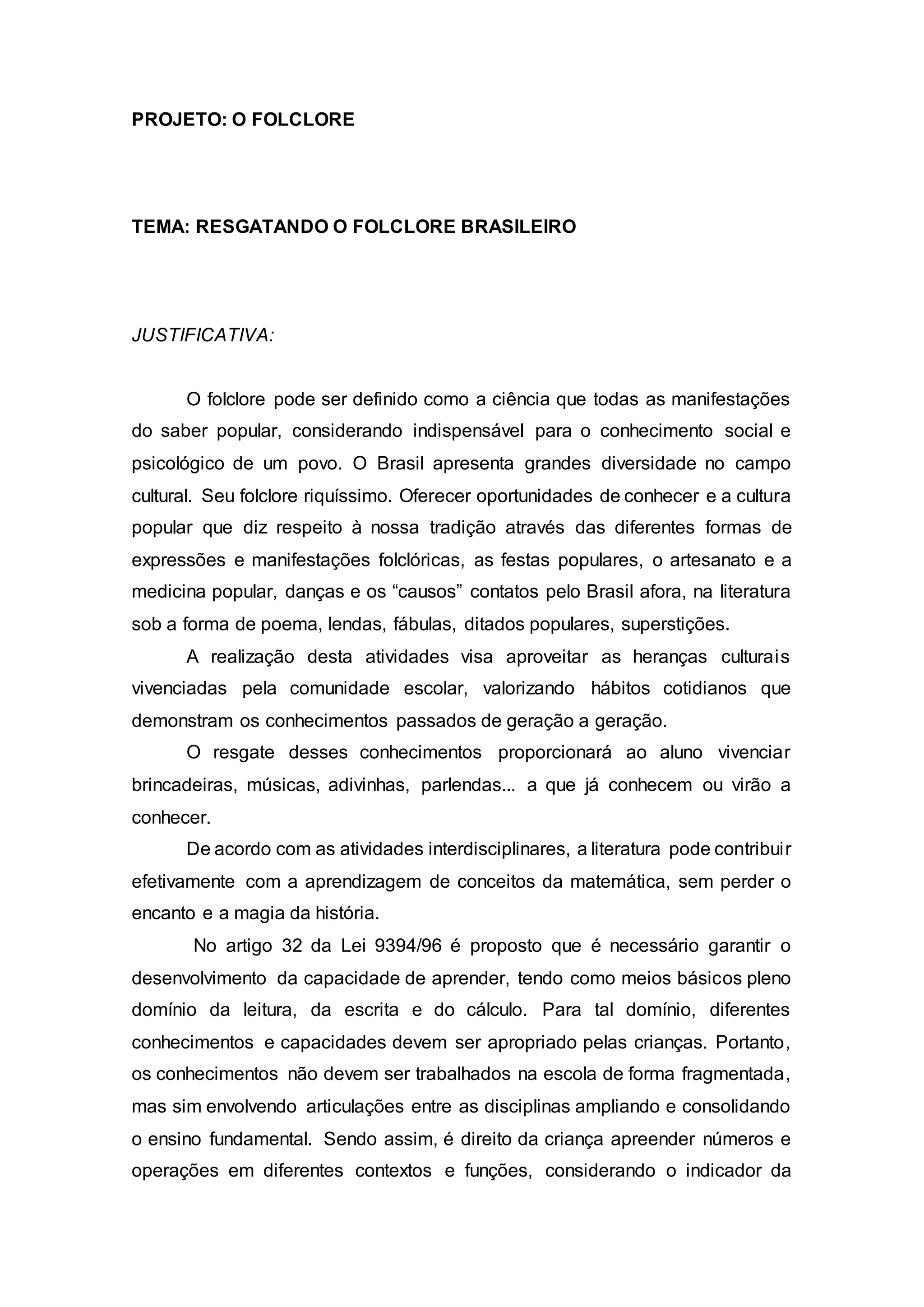 Este documento descreve um projeto para resgatar o folclore brasileiro na escola através de atividades interdisciplinares que integram matemática e cultura popular. O projeto tem como objetivos valorizar a cultura brasileira, relacionar o passado com o presente e ensinar conceitos matemáticos por meio de brincadeiras, músicas e contos populares. As atividades ocorrerão ao longo do mês de agosto e incluirão jogos, artes, culinária e apresentação dos trabalhos realizados.