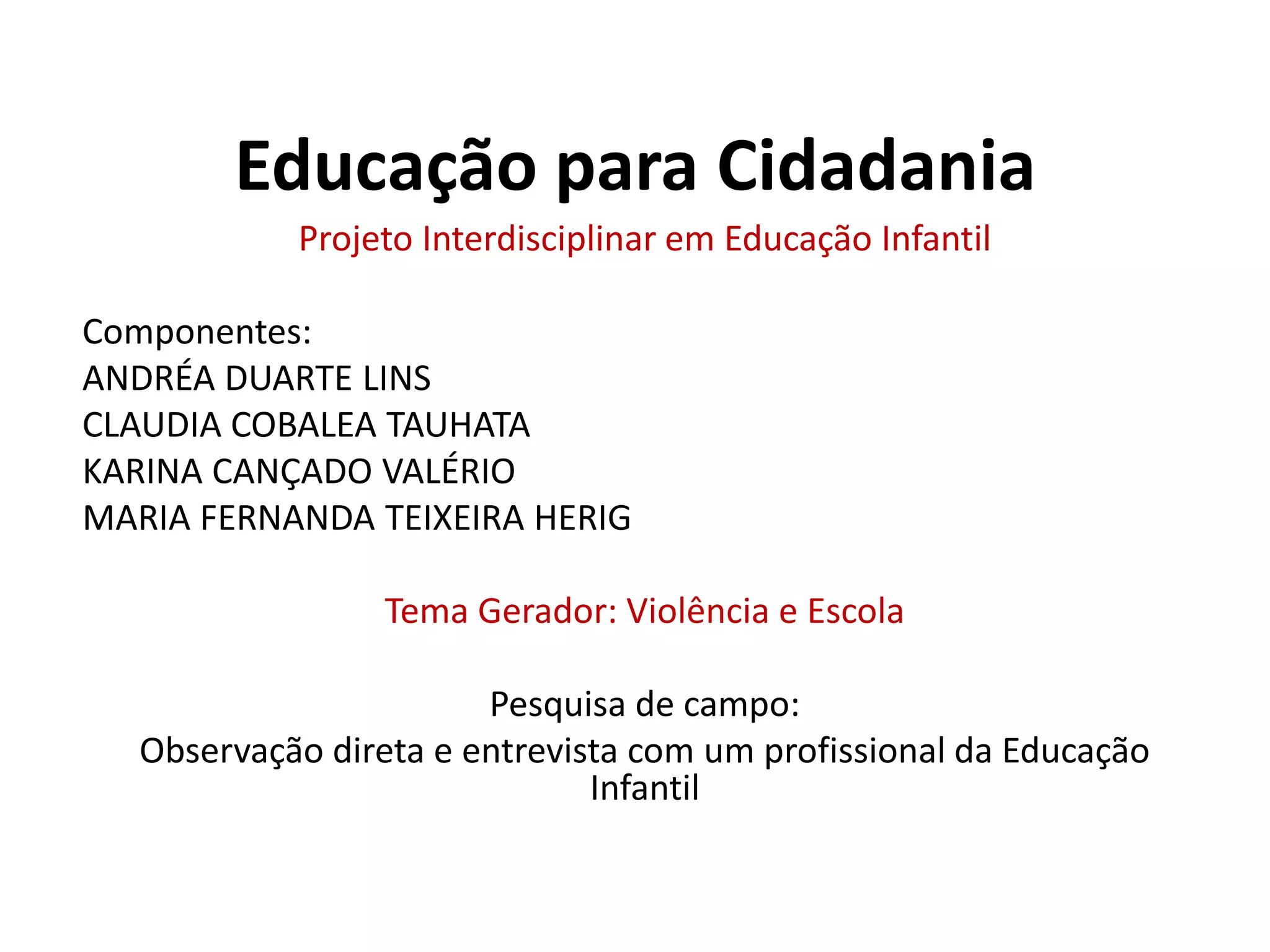 O documento descreve um projeto interdisciplinar sobre educação para cidadania em uma turma de jardim II. O projeto abordou a importância da preservação das florestas e culturas indígenas e africanas, utilizando atividades como contação de histórias, degustação e pintura. A professora enfatiza a transmissão de valores de não violência e respeito por meio de conversas, livros e dramatizações.