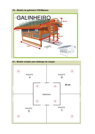O documento fornece instruções detalhadas para construir um galinheiro funcional e de baixo custo para criação de frangos caipiras, incluindo recomendações sobre os materiais, dimensões, ventilação e localização ideal considerando o clima da região.