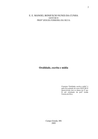 1. O documento descreve um projeto desenvolvido com alunos do 8o ano sobre oralidade, escrita e mídia.