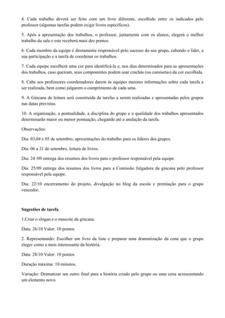 Este documento descreve um projeto de incentivo à leitura chamado "Gincana de Leitura: É Brincando que se Lê", que tem como objetivos resgatar o interesse pela leitura, desenvolver habilidades como caligrafia e interpretação de texto, e tornar a leitura uma atividade prazerosa. O projeto organiza os alunos em grupos para realizarem diversas tarefas criativas relacionadas a livros, como dramatizações, entrevistas com personagens e campanhas publicitárias, para estimular o engajamento