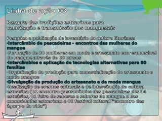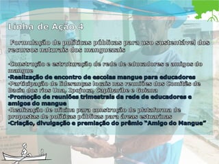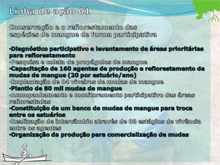 O projeto tem como objetivo melhorar a qualidade e conservação dos manguezais dos estuários dos rios Goiana, Capibaribe, Ipojuca e Una em Pernambuco, através de ações de recuperação e conservação das matas de mangue e participação das comunidades locais. Suas linhas de ação incluem conservação dos manguezais, educação ambiental, resgate da cultura local e formulação de políticas públicas para uso sustentável dos recursos naturais.