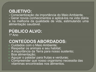O documento discute conteúdos sobre o meio ambiente, alimentação saudável e cuidados com animais para alunos do 1o ano. Aborda tópicos como cuidados com o meio ambiente, respeito aos animais, importância da terra e de uma alimentação balanceada com frutas e verduras.